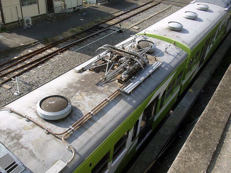 モハ3102の屋根周り。馬橋方のパンタ脇のグロベンには「流」の文字が。クーラーのファンは水色。